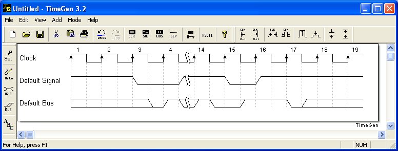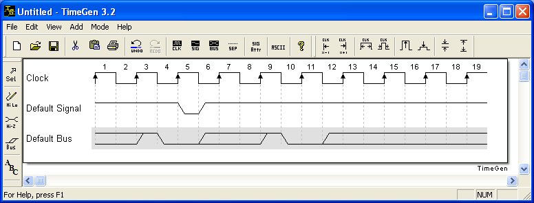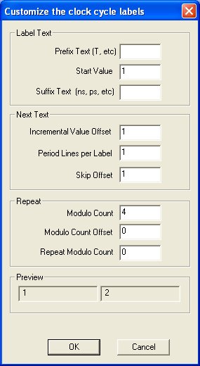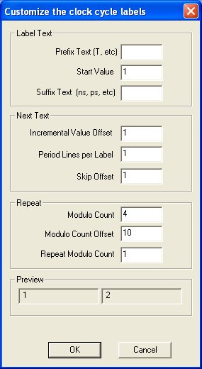 By default, the clock labels will always center itself to the period lines. By default the label spacing is setup to display every rising edge (period lines per label = 1, skip offset = 1). But, TimeGen can also display on the falling edges if required. You can program the label spacing for half cycles by setting the Period Lines per Label to 1 and skip offset to 0: